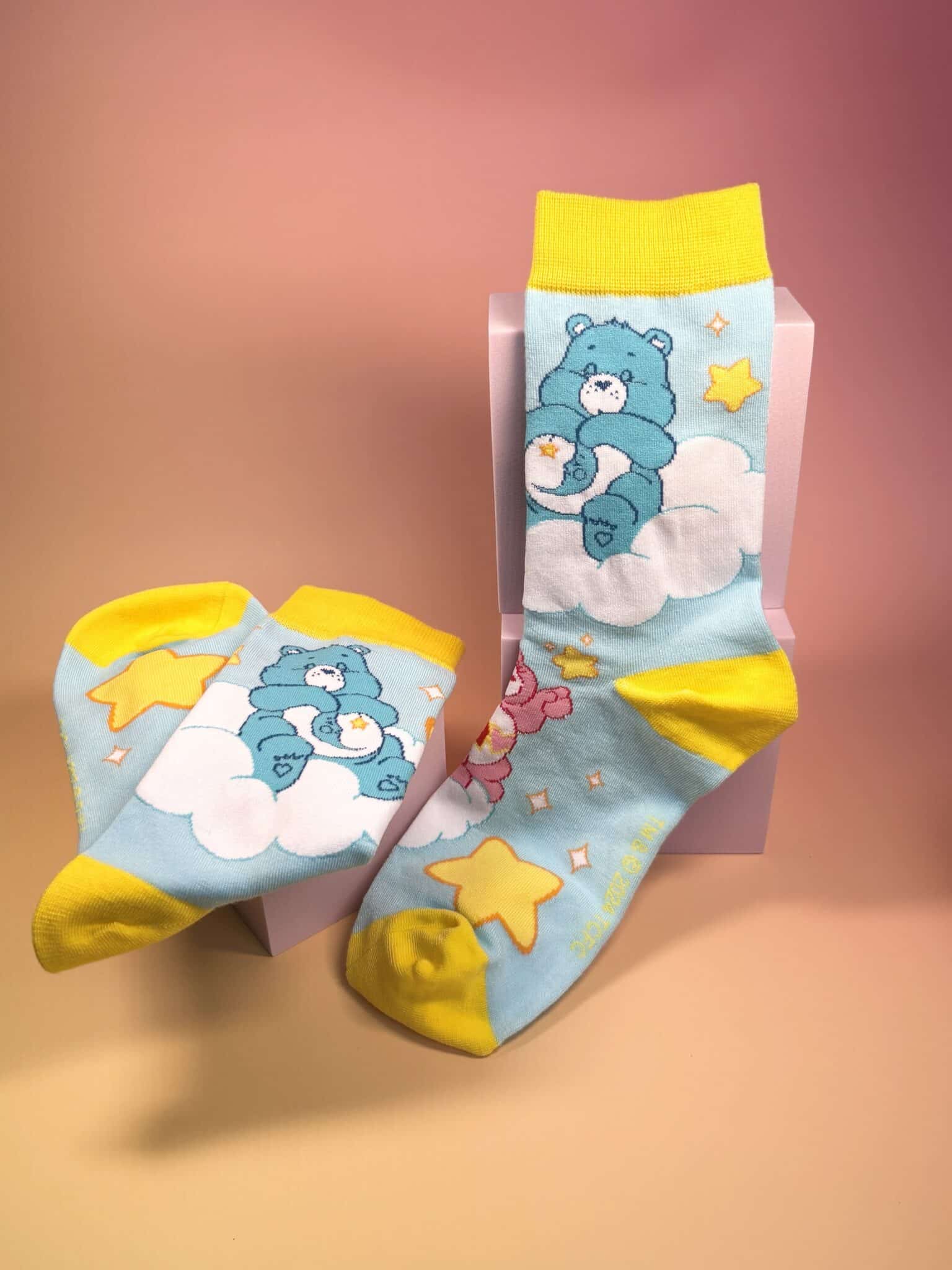 Chaussettes douces et colorées avec un motif ourson bleu et petits nuages, parfaites pour un look mignon et réconfortant.