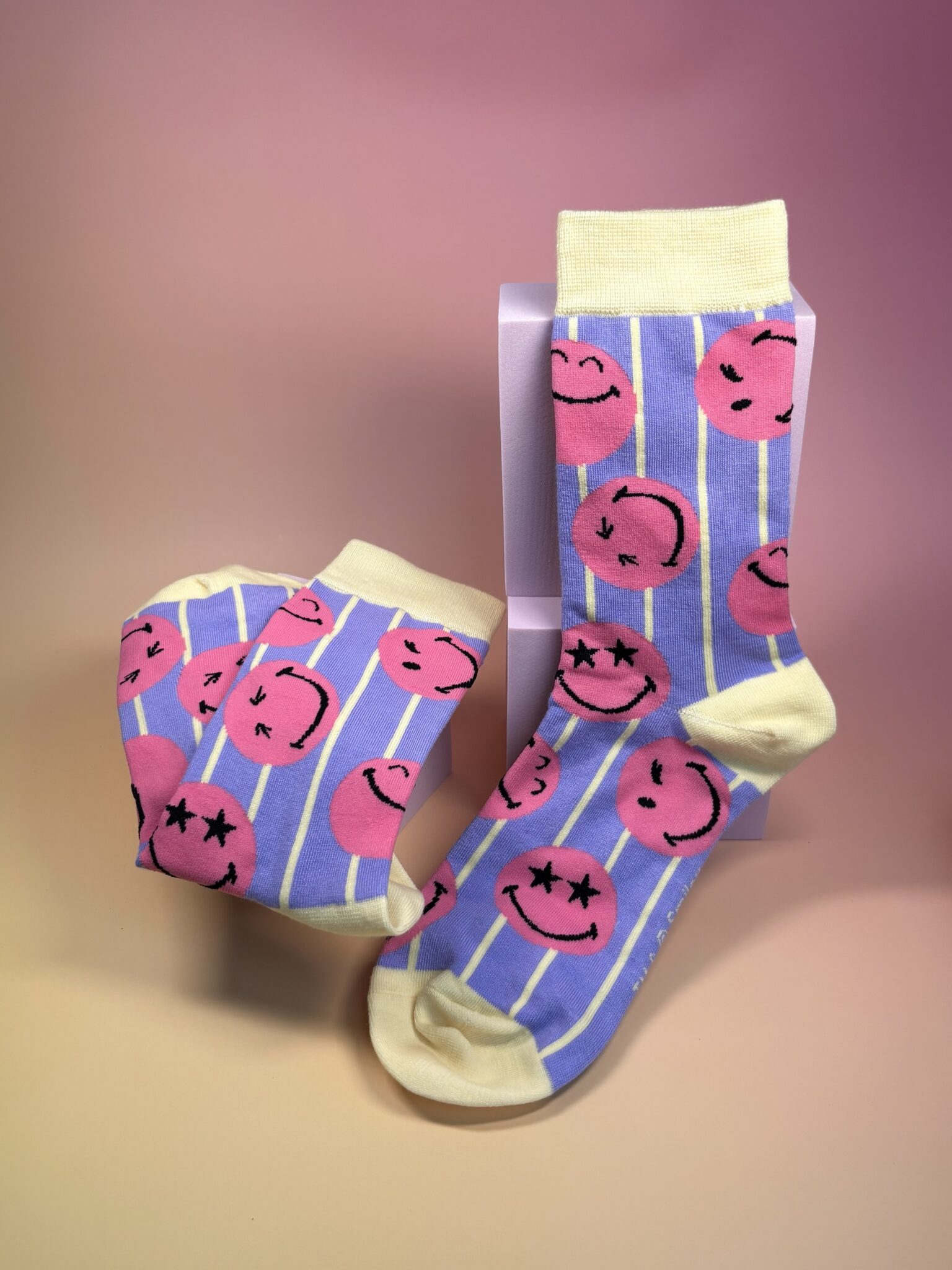 Chaussettes fun et colorées avec des smileys jaunes sur fond mauve, parfaites pour ajouter de la bonne humeur à ton look.