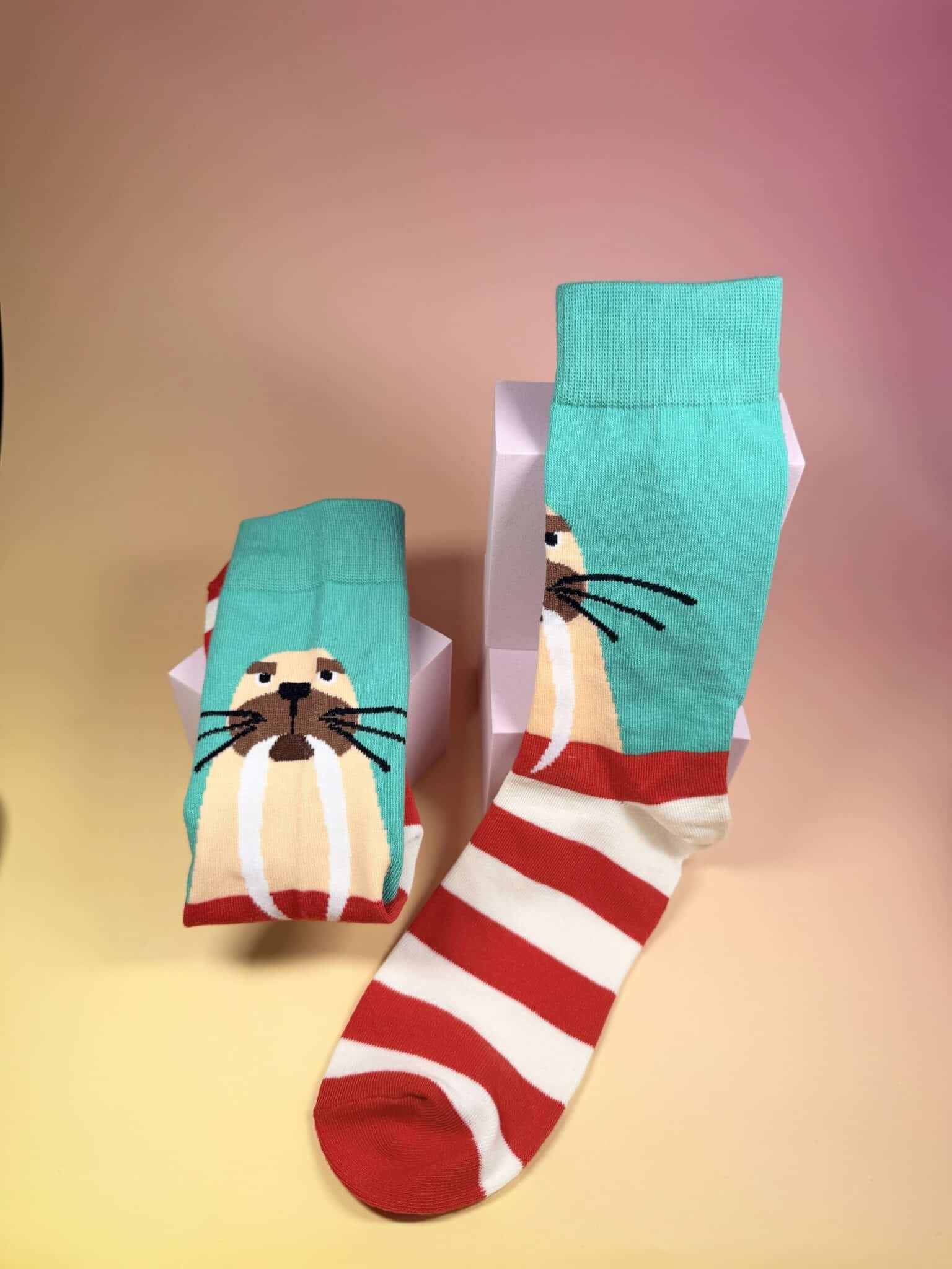Ces chaussettes dépareillées mêlent humour et style avec un duo original : un adorable morse graphique d’un côté et des rayures rouges et blanches de l’autre. Les couleurs vives et le contraste entre les motifs en font une paire pleine de personnalité, idéale pour celles et ceux qui aiment se démarquer jusque dans les détails. Douces et confortables, elles se portent facilement au quotidien.